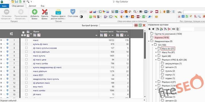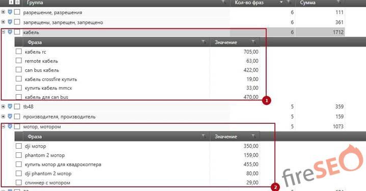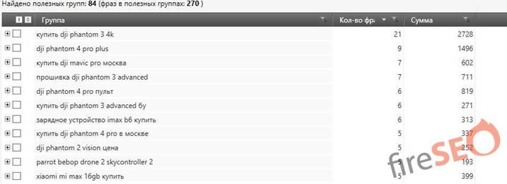 Ключевые слова уже не просто выведены по количеству вхождений в фразу, каждая группа является индивидуальной и после уточнения может быть вынесена как отдельная страница для сайта.