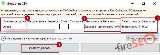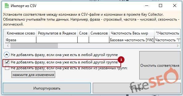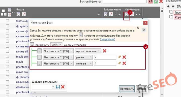 Выберите следующие параметры, которые изображены на рисунке снизу для оптимальной чистки мусорных запросов. Будьте внимательны при выборе колонки частоты, там необходимо указать именно то что актуально для вашего проекта. Если вы собирали фразовую частотность, а не точную – то сделайте соответствующий выбор.