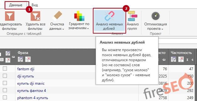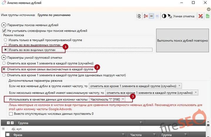 После выбора параметров – можно использовать умную отметку, которую мы настроили под наш проект, и удалить все дубли ключевых фраз: