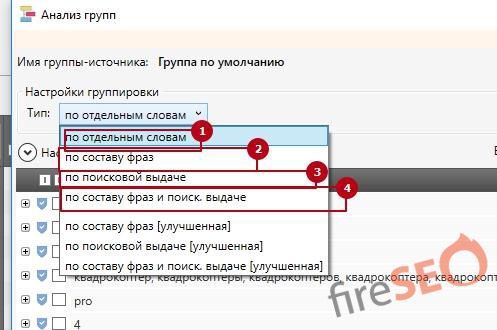 Вариант 1, который идет по умолчанию – это группировка по отдельным словам:
