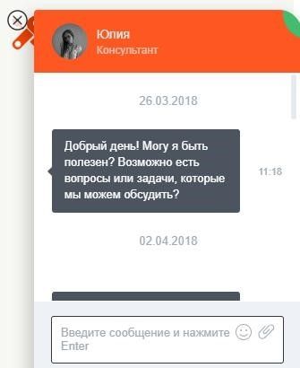 - Как только посетитель открывает ресурс, через пару секунд появляется окно чата с консультантом, тактично предлагающим свою помощь: