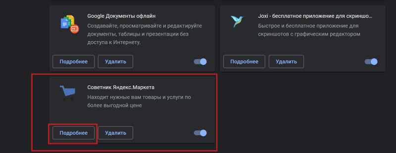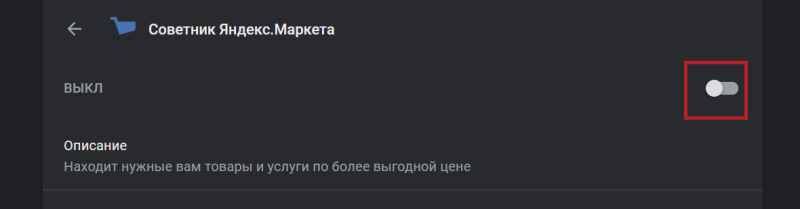Чтобы отключить расширение, выберите «Управление расширениями», в списке найдите «Советник», кликните на кнопку «Подробнее», выключите приложение на открывшейся странице.