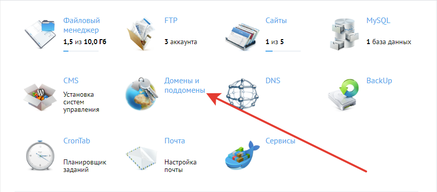 1. Входим в панель управления хостингом по ссылке: https://cp.beget.com и нажимаем пункт “Домены и поддомены”: