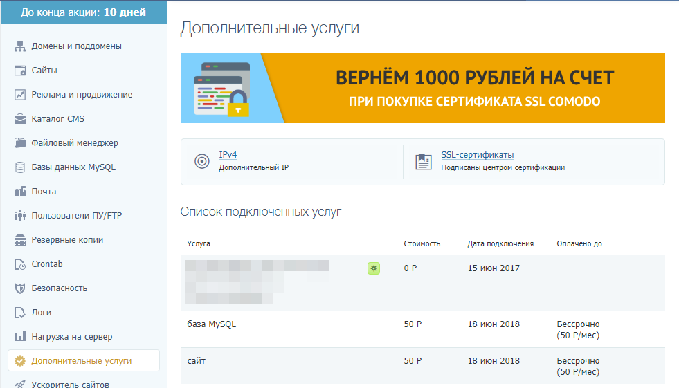 1. Входим в панель управления хостингом по ссылке: https://hosting.timeweb.ru/ и нажимаем пункт “Дополнительные услуги”: