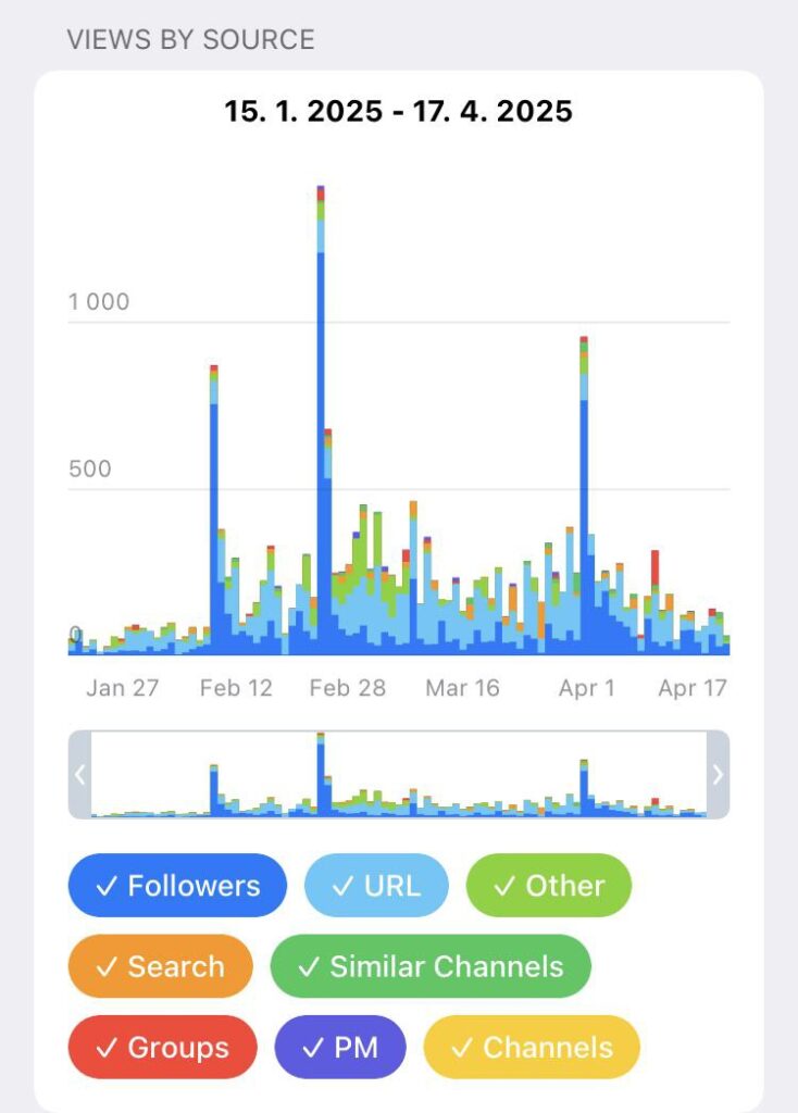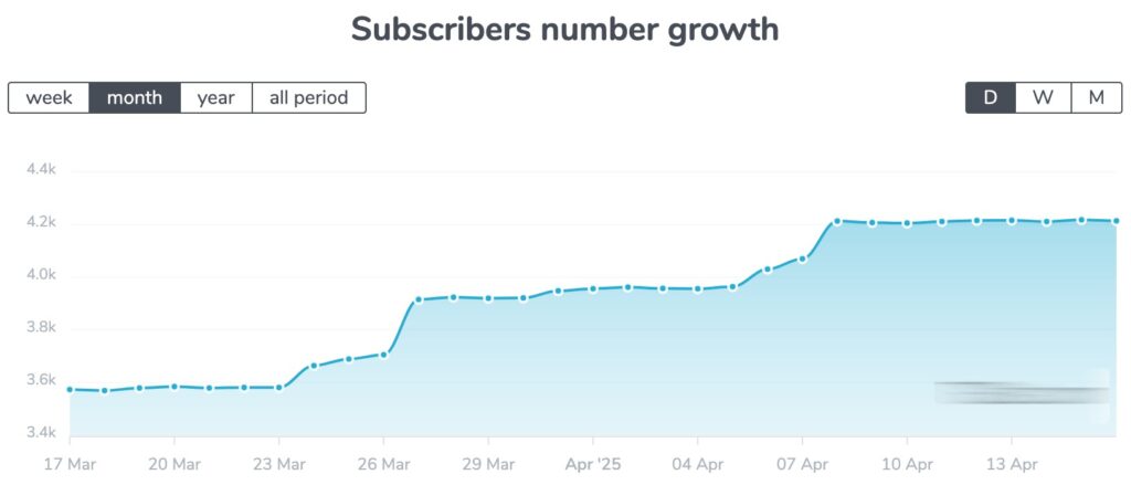 Если за определенный день видим большой рост числа подписчиков, но нет ссылок с других каналов за этот день — это первый сигнал, что подписчики куплены.