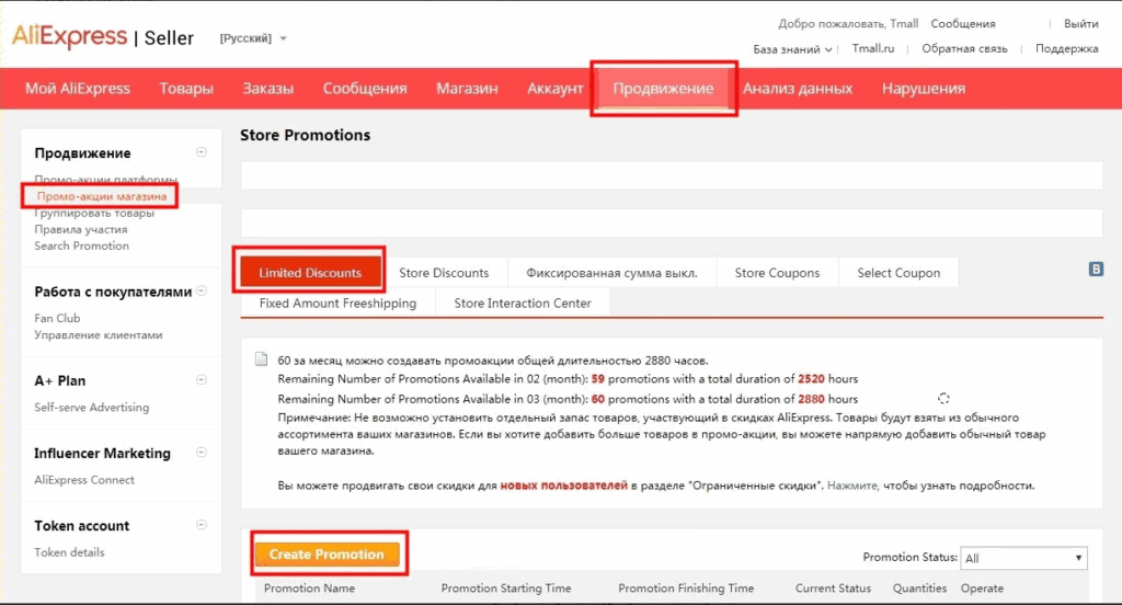 Маркетплейс AliExpress позволяет бесплатно продвигать продукцию внутри магазина путем предоставления скидок. В месяц можно добавить до 60 наименований для акции общей длительностью не более 2880 часов.