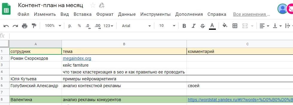 a) Ежемесячно составляете контент-план с указанием авторов и тем, которые за ними закреплены. Мы это делаем в Google Docs: