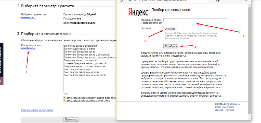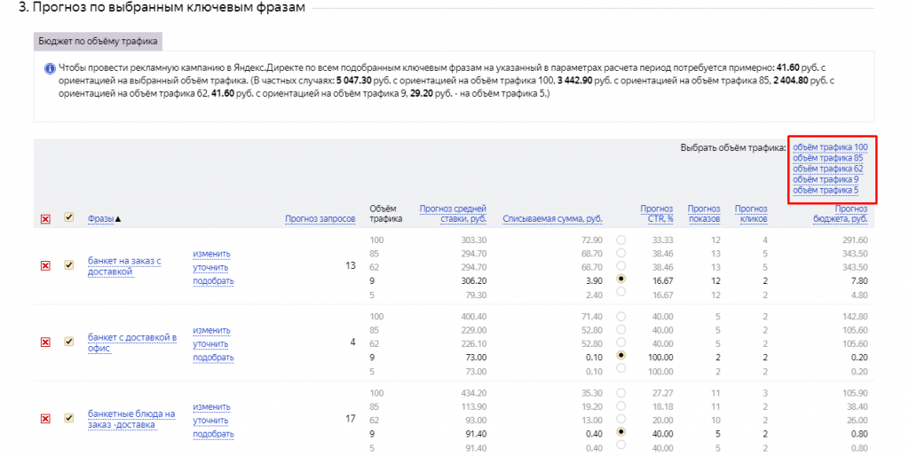 Зайдите в систему, авторизуйтесь и нажмите «Прогноз бюджета». Затем скопируйте список ключевых запросов и вставьте их в третье поле с названием «Подберите ключевые фразы».