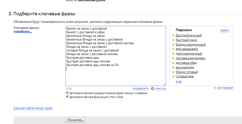 Когда список готов, подготовьте минус-слова (хотя бы 10-15 шт.), чтобы результаты прогноза были точнее. Теперь можно приступать к оценке рекламного бюджета для контекстной рекламы.