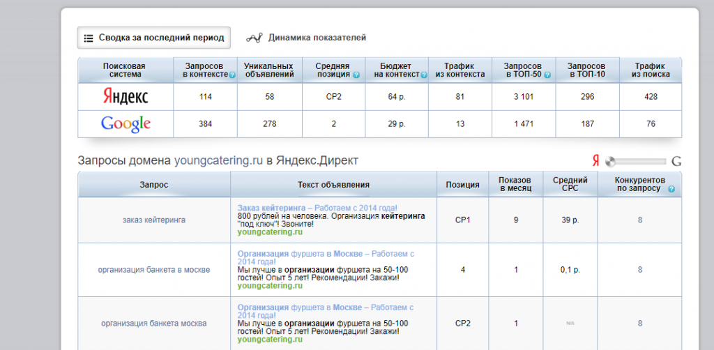 Введите доменный адрес ближайшего конкурента. Система соберет ключевые запросы, по которым показывается интересующий сайт в выдаче контекстной рекламы. Она посчитает количество запросов в контексте, средние позиции, трафик и бюджет на РК.