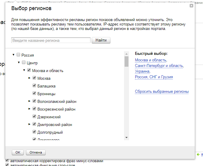 2. Вводим необходимый регион показа, допустим — Москва и область: