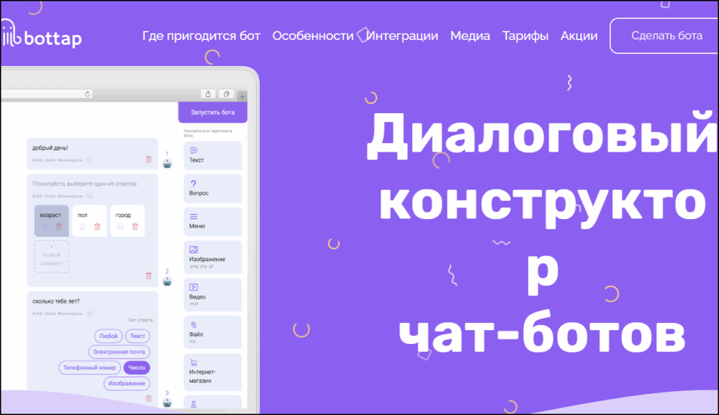 Bottap завершает список ТОП 9 лучших конструкторов. На этом сервисе можно создать бота для интернет-магазина, салона красоты, фитнес-тренера или юридической конторы. Интерфейс простой, понятный. Пробный период равен 7 дням. Есть разные тарифные планы от 99 рублей в месяц без просмотра статистики, до 1190 рублей в месяц со всеми функциями.