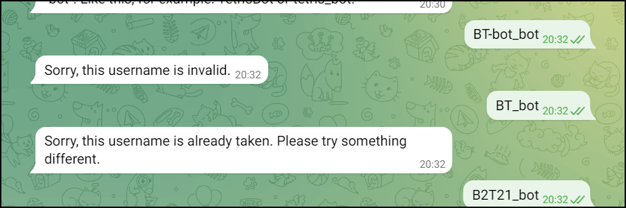 5. Если название уже будет в системе, то «отец всех ботов» откажет в создании ключа для написанного имени. Нужно будет переименовать. Если не будет прописано слово «bot», то система попросит еще раз написать это имя и прописать «_bot».