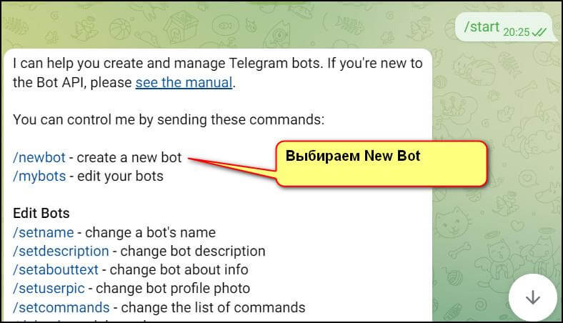 3. Botfather откроет перед пользователем меню с командами. Человек должен выбрать команду «NewBot». Кликнуть по кнопке «Enter».