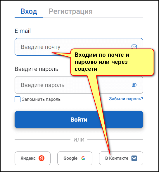 4. После прохождения регистрации нужно войти под логином и паролем. Или через одну из предложенных социальных сетей.