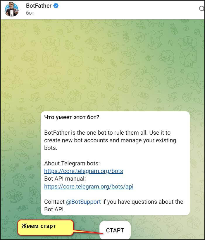 2. Войти этот бот и кликнуть по кнопке «Start». Ботфазер – это отец всех ботов.
