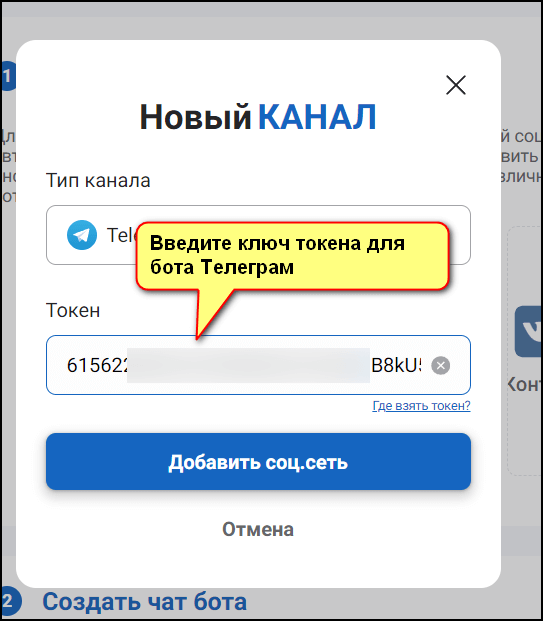 6. Выбрать социальную сеть Телеграм и вписать в соответствующее поле ключ токена. Кликнуть «Добавить соцсеть».