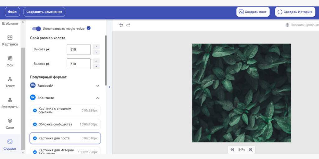 - Можно автоматически менять размер креатива под нужную соцсеть.