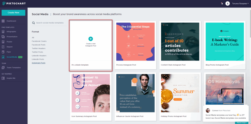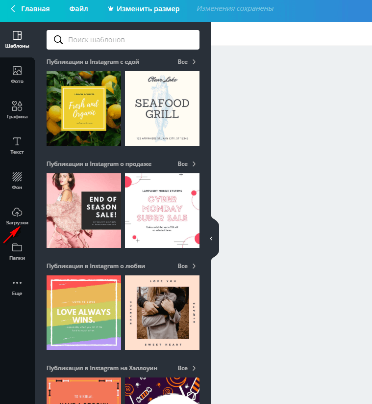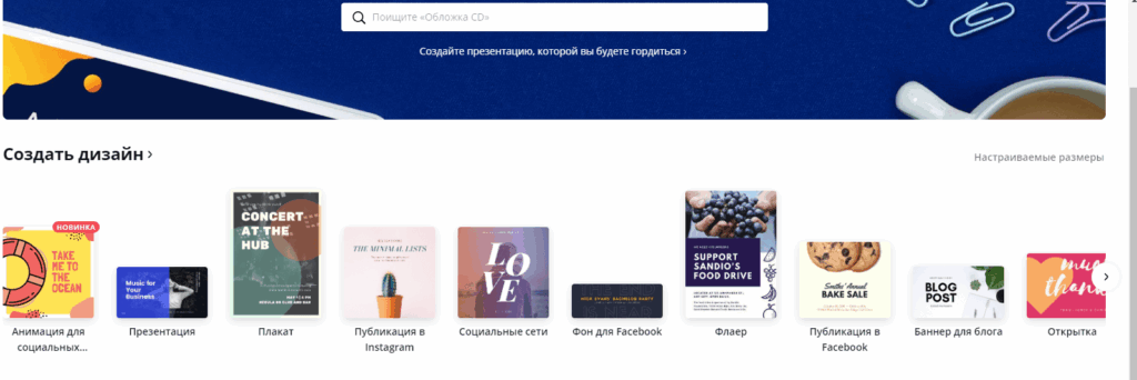 Canva – онлайн-сервис, любимый SMM-специалистами. В нем русскоязычный интерфейс, много бесплатных возможностей. Здесь можно создавать записи для ВКонтакте, Facebook, Instagram, баннеры для блога, флаеры, макеты обложек книг, меню и прочее.