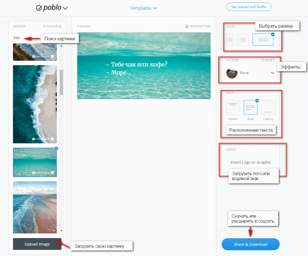 Pablo нельзя назвать полноценным редактором фотографий. Но если нужно просто написать текст на изображении, при этот не регистрируясь в сервисе, этот сайт вполне подойдет.