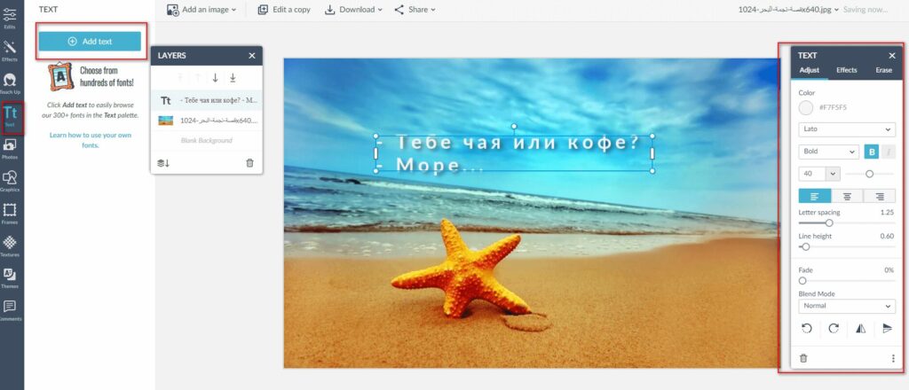 - Для текста есть эффекты: разные шрифты, цвета, расстояния между буквами, прозрачность, тень и пр.