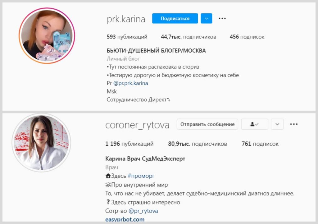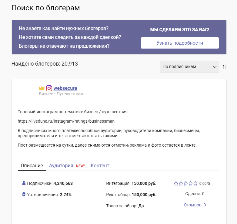 Не обязательно выбирать блогеров-миллионников. Стоимость рекламы в подобных профилях стоит десятки тысяч рублей. Можно подобрать блогера с 1050 тыс. подписчиками. Главное, чтобы интересы ваших аудиторий пересекались. Такие микроблогеры могут привести куда больше заинтересованных фолловеров, чем миллионики, на которых подписывается очень разношерстная публика.