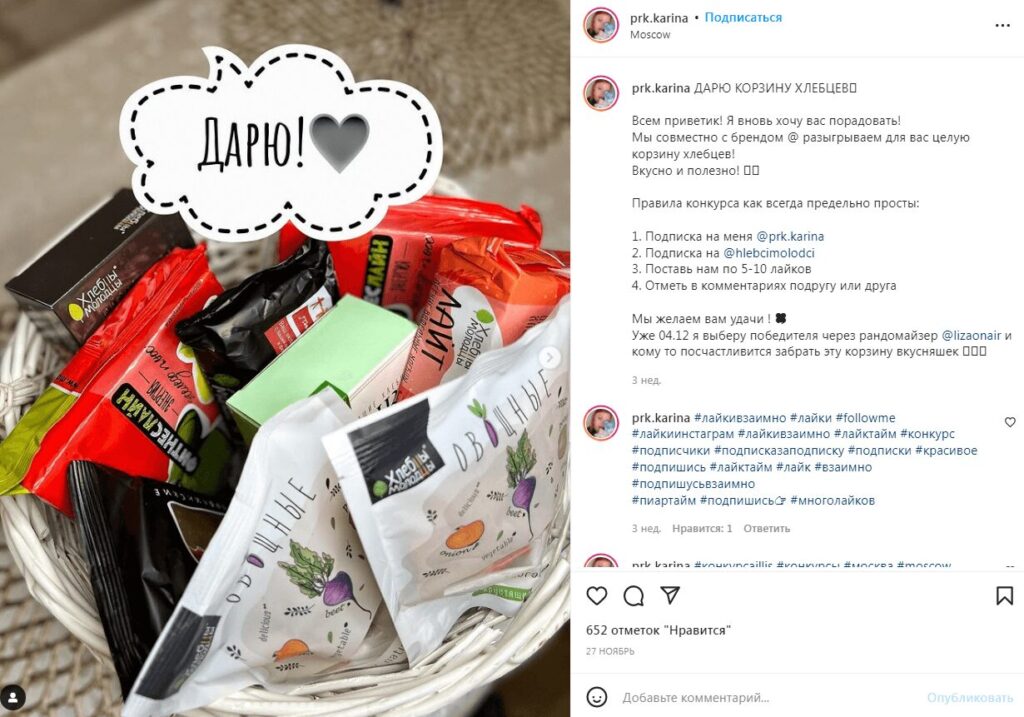 Один из популярных методов раскрутки в Инстаграм это различные конкурсы с подарками. Правила просты быть подписанным на блог, поставить лайк к записи и отметить 12 друзей в комментариях. Такие конкурсы можно проводить вместе с кем-то, если своих подписчиков маловато.