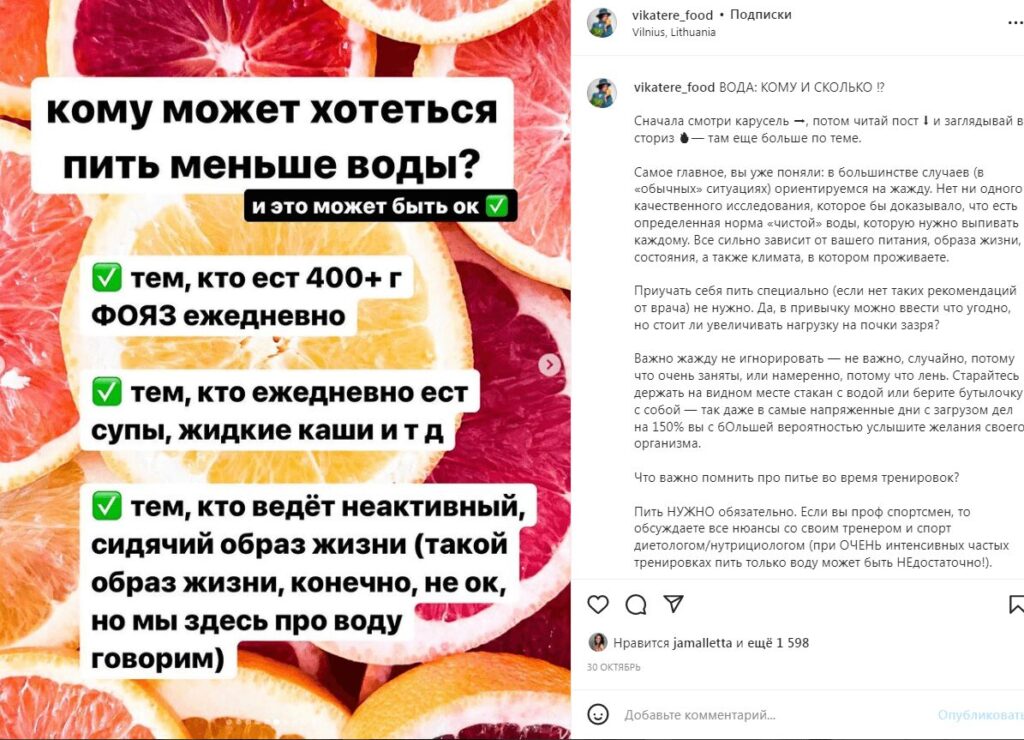 Само собой, публикации должны быть полезными и интересными, чтобы стимулировать фолловеров оставить лайк или комментарий. Но чтобы сильнее повысить вовлеченность, можно писать посты на изображении. То есть под фото публикуется подводка, а остальной текст размещается на картинке (белой, цветной, с фоном). Нажимая на новый слайд, пользователи будут взаимодействовать с профилем. А чем больше точек касания, тем лучше для продвижения.