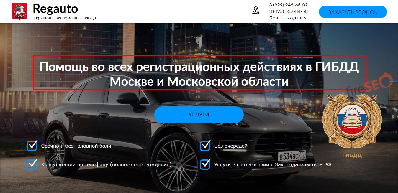 Наши специалисты дополнили страницу логотипом, в котором отображена специфика деятельности фирмы и ее серьезный подход. А затем мы сформулировали основные преимущества, побуждающие клиентов обратиться за услугой именно в Regauto. Наличие такой информации на сайте вызывает больше доверия у потенциальных клиентов: