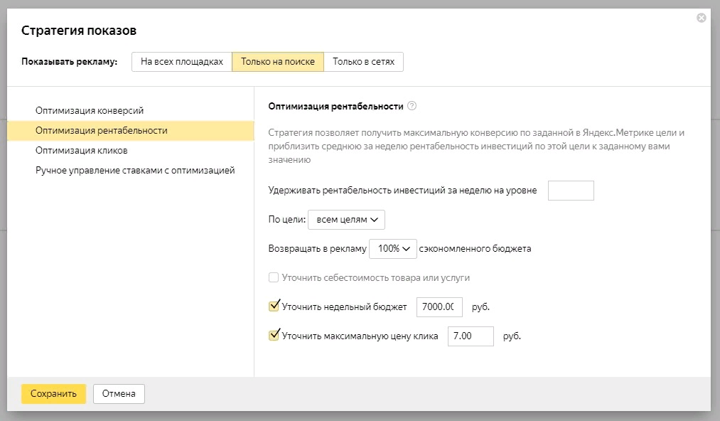 Стратегия подойдет рекламодателям, которые определили цели размещения рекламы и знают, какое соотношение прибыли и расходов на Директ предпочтительно.