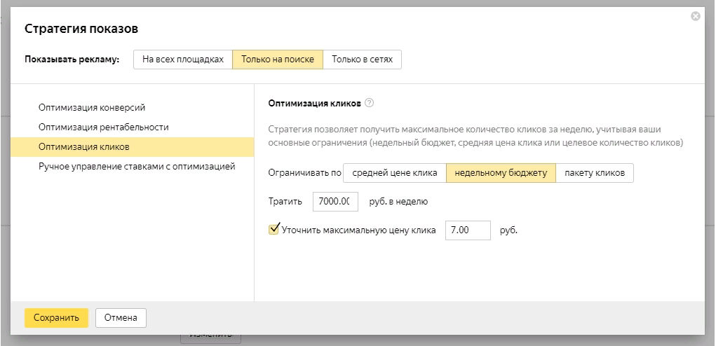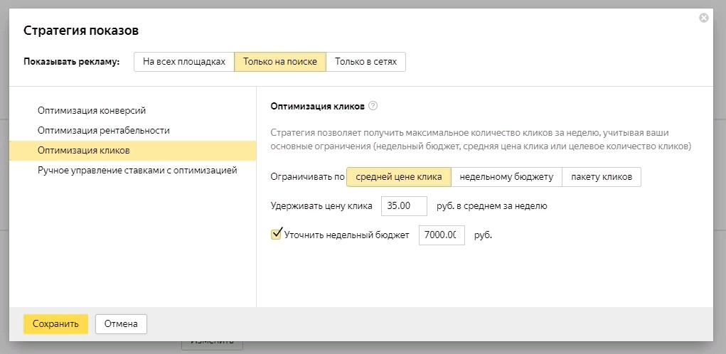 После запуска такой стратегии система автоматически выставит фразам ставки так, чтобы за указанный недельный бюджет рекламодатель получил наибольшее число кликов.