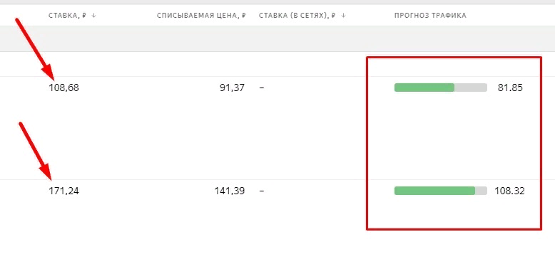 При выставлении ставок ориентируйтесь на процент получаемого трафика. Чем выше ставка, тем больше трафика получаете: