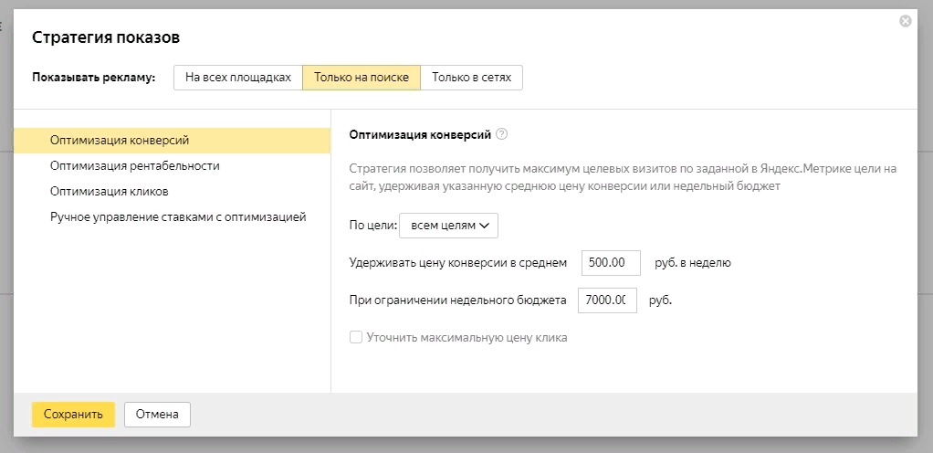 Если решите использовать такую стратегию, то выставляйте дневной бюджет и не настраивайте сразу ставки по-максимуму. Начните с малого, а дальше, анализируя статистику переходов и мест показов объявлений, поймете – какая ставка предпочтительна.