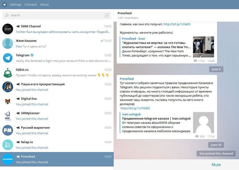 По своей сути сообщество в Telegram напоминает публичные страницы в известных социальных сетях, но механика взаимодействия с подписчиком немного отличается. После того как пользователь подпишется на канал, он сразу же начинает видеть уведомления о новых публикациях, и пока он не зайдет в «разговор» ему будет высвечиваться счетчик непрочитанных сообщений, как SMS.