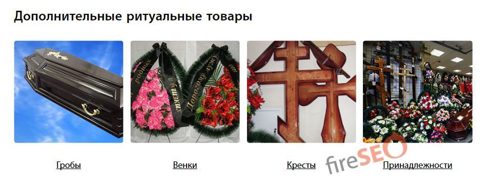 Дальше для удобства посетителей сайта мы разместили дополнительные ритуальные товары. Кликнув на интересующую группу, пользователь переходит на отдельную страницу – где представлен полный список товаров с их изображениями и детальной информацией: