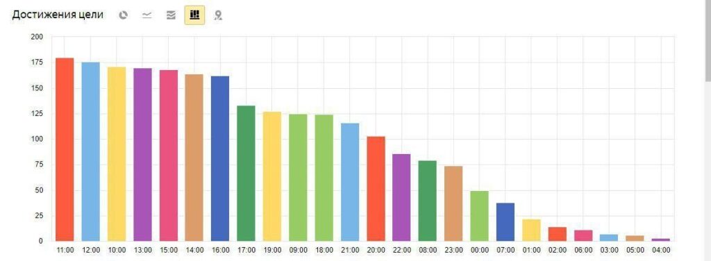 В Метрике четко видно, что большее число просмотров рекламных объявлений ЦА и конверсий  по другим источникам трафика приходится на время – с 08:00 до 18:00: