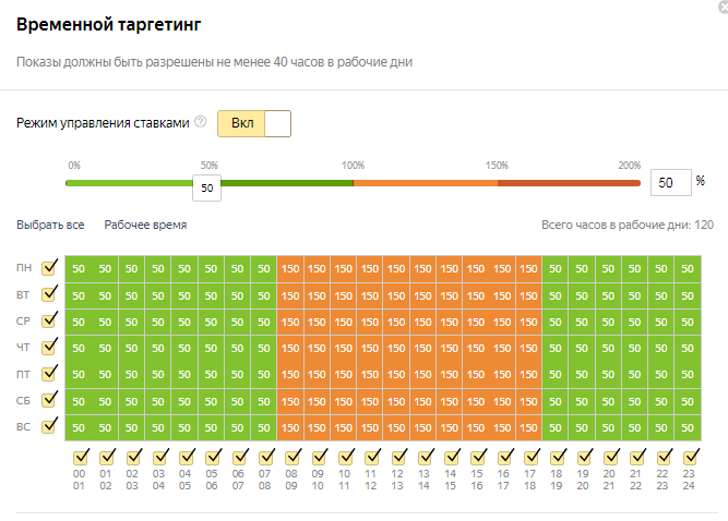 Что сделали: поработали в РК с корректировками по времени – настроили временной таргетинг: