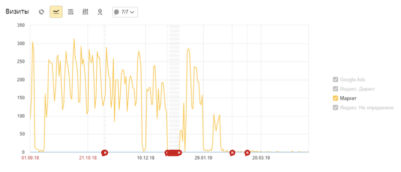 К нам обратился официальный дилер бренда Schneider Electric за ведением кампании в Яндекс.Маркете. При хорошей выгрузке, с точки зрения заполнения параметров товаров, количество визитов на сайт клиента постепенно уменьшалось.