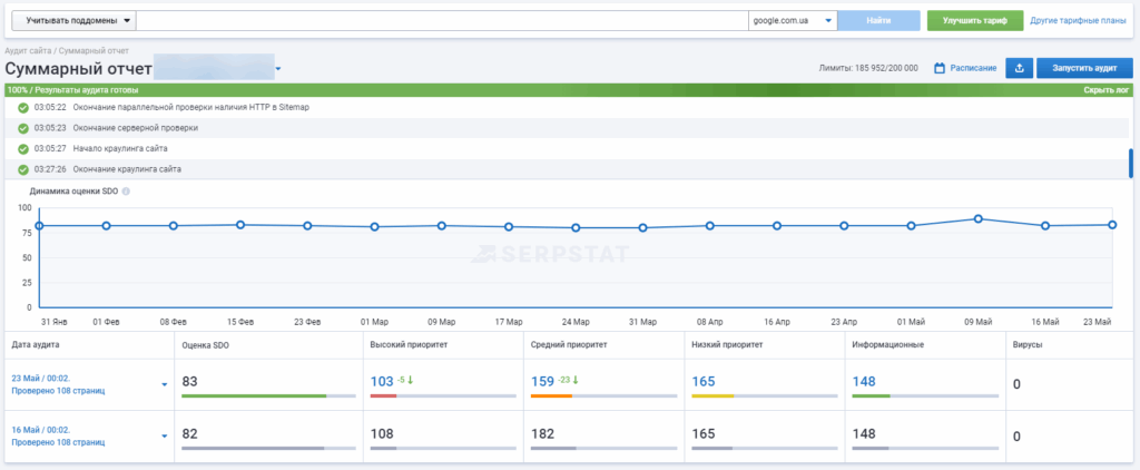 - помимо описанных модулей проверки сайта и конкурентов, на постоянной основе мы используем сервис аудита, который помогает всегда быть в курсе актуальной информации о сайте:
