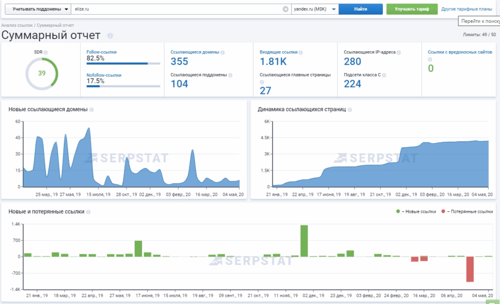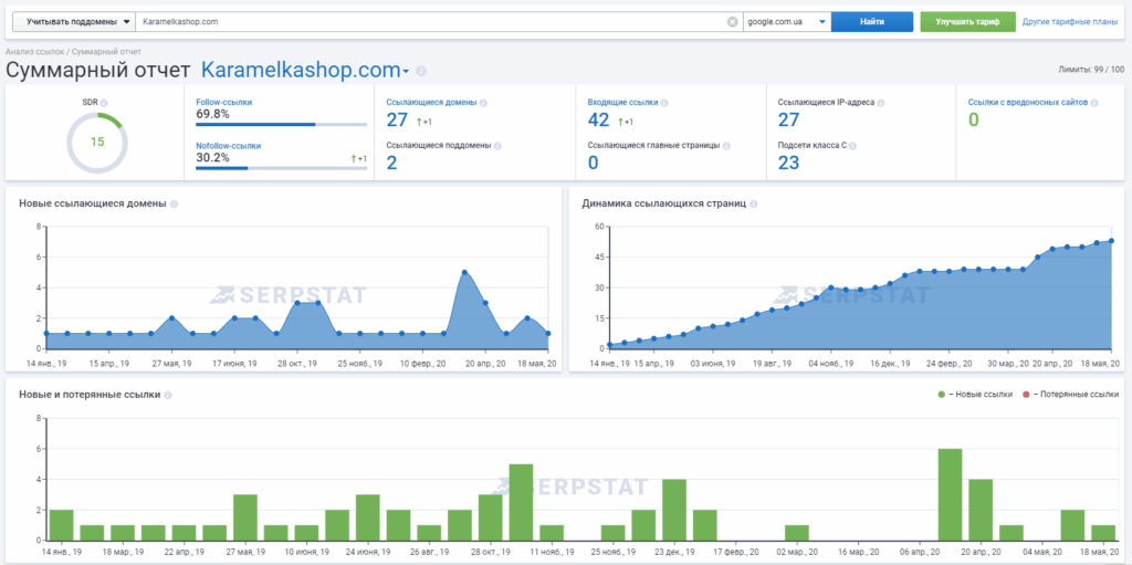 Для внутренней ссылочной стратегии нам помогает PageWeight, а для внешней — опять же Serpstat. В отчете по ссылкам мы анализируем: