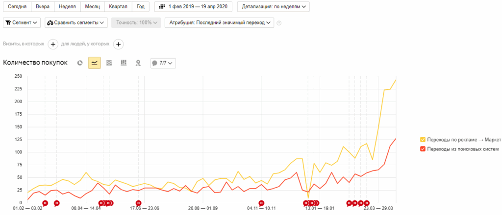 Ну и ради интереса, раз уж мы в начале упомянули Яндекс.Маркет, сравнение продаж с Маркета и двух поисковых систем: