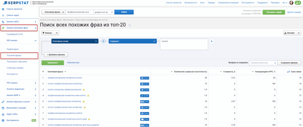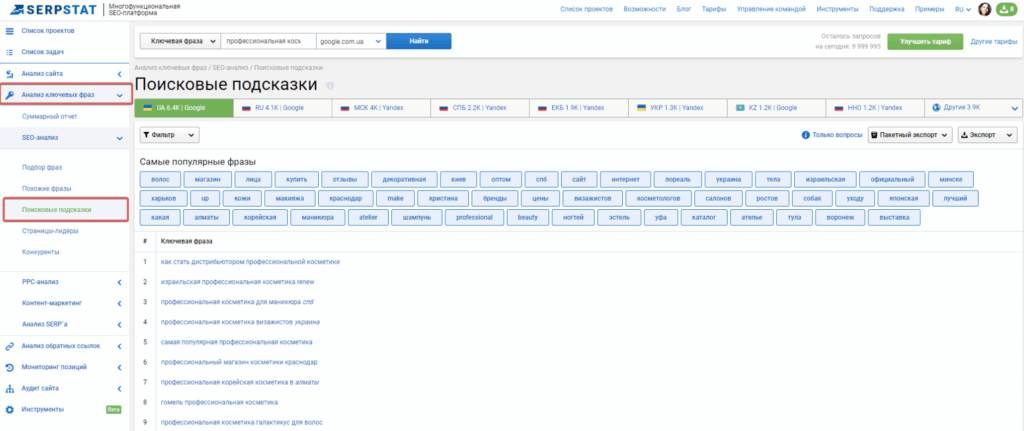 На этом этапе собираем фразы и подсказки из базы Serpstat.