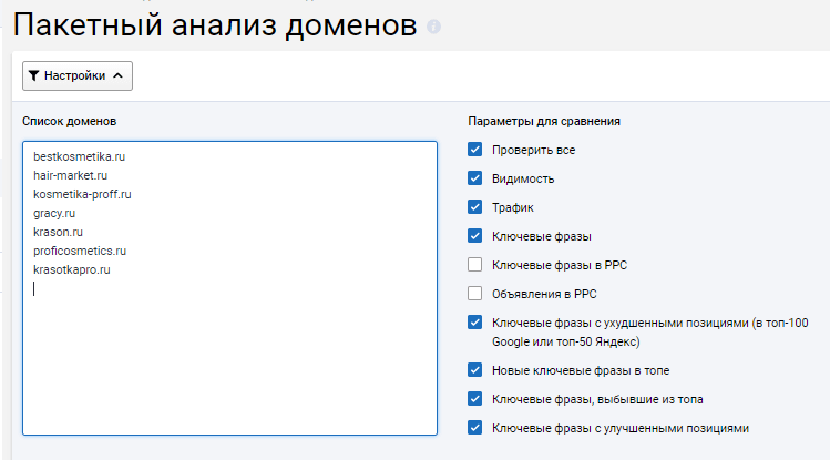 Собираем возможных конкурентов по регионам и с помощью пакетного анализа, оставляем только прямых и успешных, чтобы их анализировать.