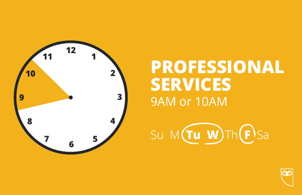 В среднем ведущие бренды профессиональных услуг получают бОльший охват, выкладывая посты в начале рабочего дня, особенно по пятницам, вторникам и средам. Как правило, это образовательный или познавательный контент, который люди предпочитают читать на свежую голову или в качестве раскачки перед рабочим днем.