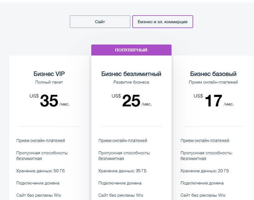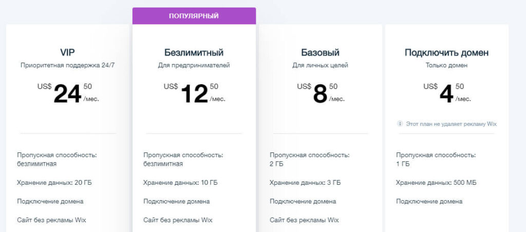 Самый дешевый (4.5 $/мес.) предполагает наличие рекламы Викса. Нормальный лендинг на нем не построить. В остальных тарифах рекламы нет. Цены ниже: