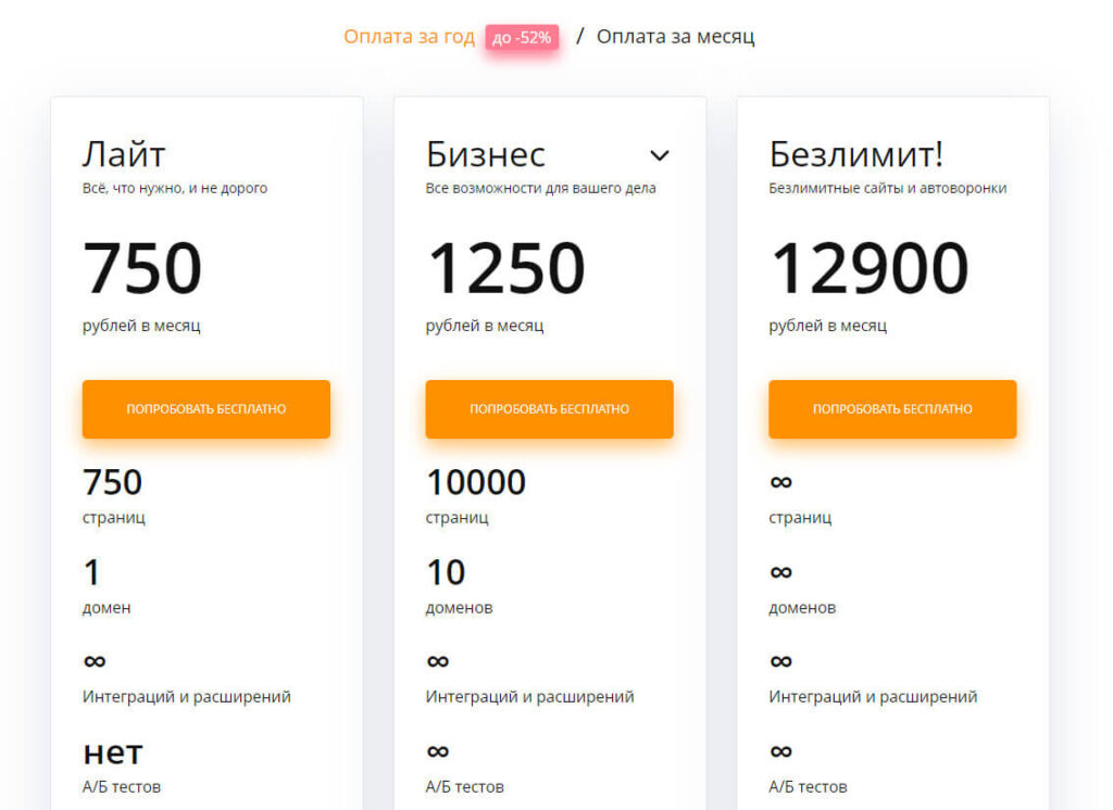 Тарифа всего три. Самый дешевый позволяет создать 750 страниц, подключить CRM-систему, аналитику, онлайн-оплату, модули. Он поможет начинающим бизнесменам создать полностью рабочий лендинг, который будет приводить клиентов.