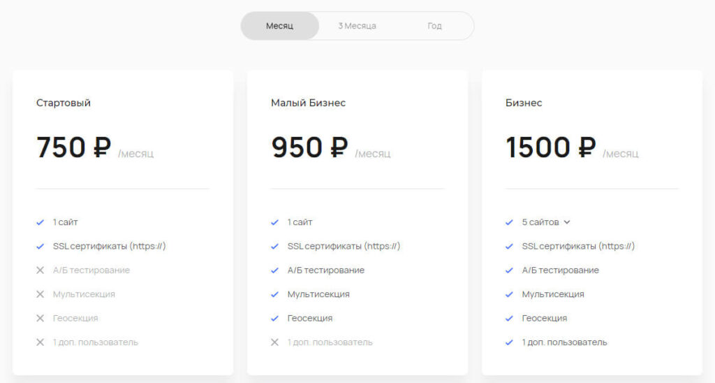Тарифных плана три. Последние два позволяют провести тестирование, настроить показ контента для пользователя исходя от показанной ему рекламы, а также менять содержимое сайта в зависимости от региона продвижения посетителя.