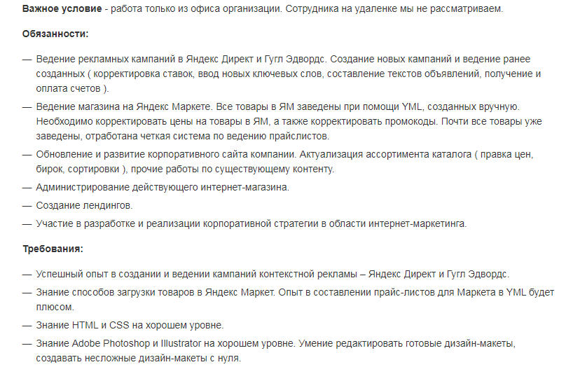 В первой от соискателя требуют выполнения обязанностей специалиста по контекстной рекламе, администратора сайта, маркетолога, дизайнера.