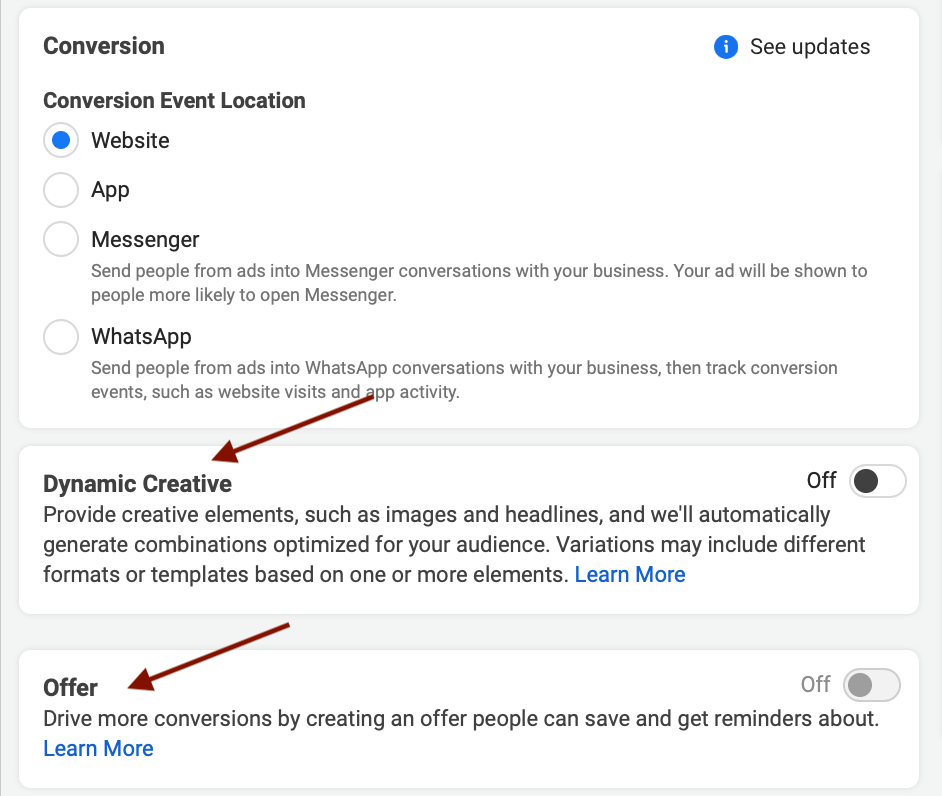 Далее, после того как вы пройдете через экран, где вы сможете зарегистрировать специальные категории объявлений и выбрать варианты оптимизации бюджета, вы заложите основу для вашей кампании по конверсиям. Прежде всего, вы должны выбрать, какие конверсии вы хотите отслеживать. Вы можете выбрать источник конверсий, например, веб-сайт, мобильное приложение, Messenger или Whatsapp. Здесь же вы можете выбрать конкретные события для отслеживания (например, добавление товара в корзину и переход к оформлению заказа). Убедитесь, что ваш пиксель настроен на отслеживание этих событий.