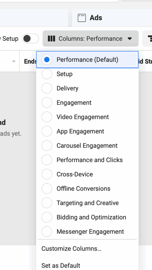 Чтобы проверить активные и прошлые кампании, используйте Facebook Ads Manager. Вы можете настроить основную панель отчетов, добавив дополнительные столбцы с информацией, относящейся к конкретной кампании. Для этого нажмите на Столбцы: Результативность, а затем прокрутите страницу вниз до Настроить столбцы…